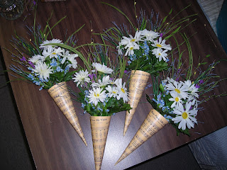 Here are 4 of 6 cones that will hang on the end of the chapel pews, instead of bows. I need ribbon and a few more flowers to finish this fun project.